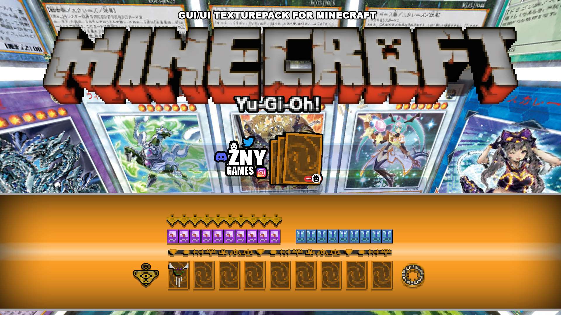 You'll enjoy a brand-new hotbar, experience bar, hunger bar, health bar, and armor bar, all designed with a Yu-Gi-Oh! aesthetic.